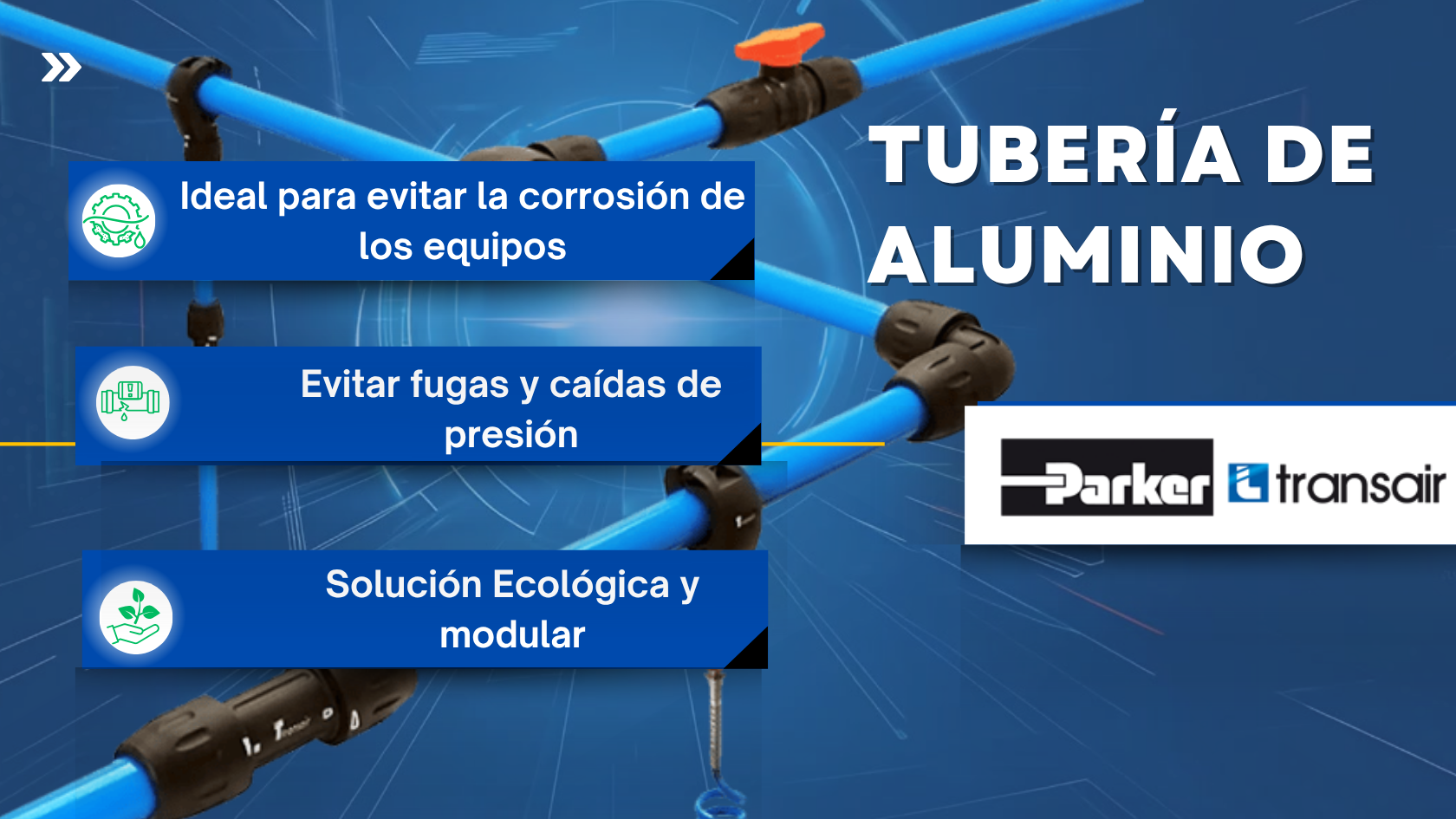 Con tubería de aluminio parker transair; evita la corrosión de los equipos, evitar fugas y caídas de presión. Solución ecológica y modular
